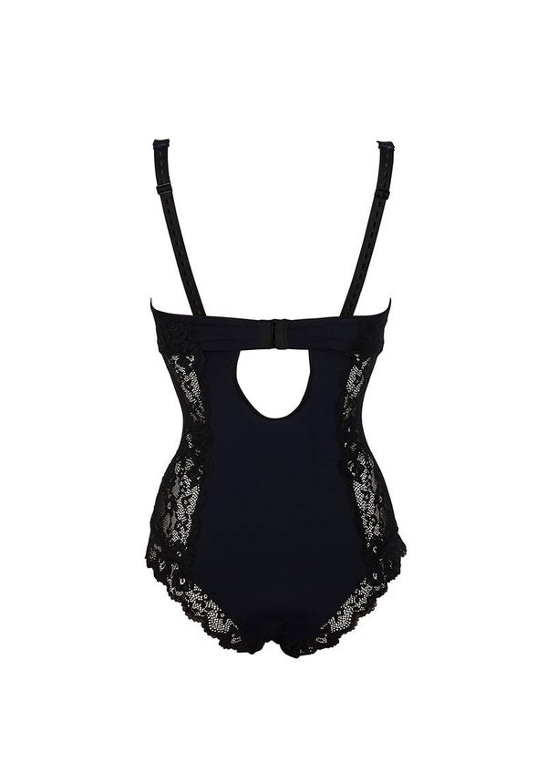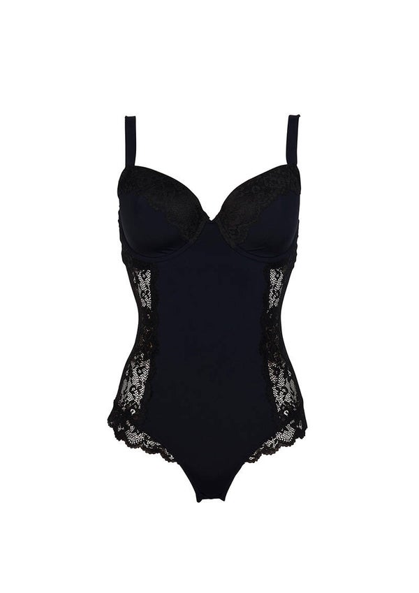 Voorgevormde demi cup body in recycled kant en micro. Elegante en vrouwelijke belijning door de plaatsing van het kant. De body heeft een beha gedeelte.